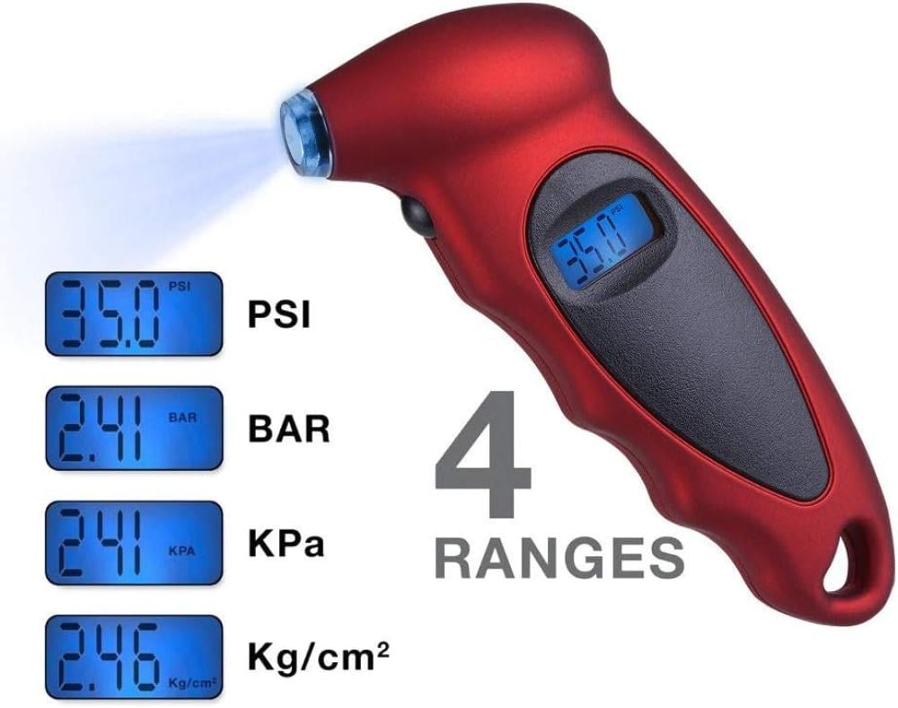 المواصفات: أربعة نطاقات للقياس: 0-150 باوند لكل انش مربع 0-150، بار، كيلو باسكال، كجم/ سم 2 الحد الأدنى للزياد: 0.5 باوند لكل انش مربع مصدر الطاقة: قرص خلية ليثيوم CR20323 بقدرة 3 فولت وثلاثة خلايا على شكل أزرارLR44 بقدرة 1.5 فولت (جميعها متضمنة)